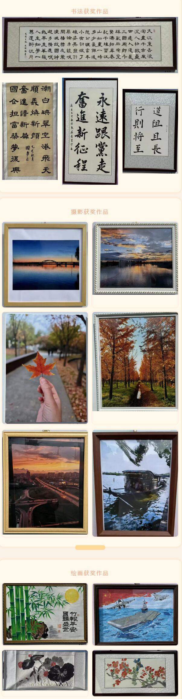 活動(dòng)現(xiàn)場(chǎng)布置井然有序,50余幅攝影、繪畫(huà)、書(shū)法作品集中展示,題材豐富、形式多樣。參展作品緊扣“賀華誕、繪盛世”主題,聚焦新時(shí)代發(fā)展成就,展現(xiàn)順義建投責(zé)任擔(dān)當(dāng),講述“青鋒英才奮斗故事”,兼具思想性與藝術(shù)性,充分展現(xiàn)了順義建投干部職工積極向上的精神風(fēng)貌。展覽活動(dòng)現(xiàn)場(chǎng),參展人員認(rèn)真觀展,依據(jù)評(píng)選規(guī)則進(jìn)行投票,最終評(píng)選出一等獎(jiǎng)3名、二等獎(jiǎng)5名、三等獎(jiǎng)6名。公司領(lǐng)導(dǎo)為獲獎(jiǎng)作者頒發(fā)榮譽(yù)證書(shū),對(duì)其優(yōu)秀創(chuàng)作成果予以表彰。書(shū)法獲獎(jiǎng)作品攝影獲獎(jiǎng)作品